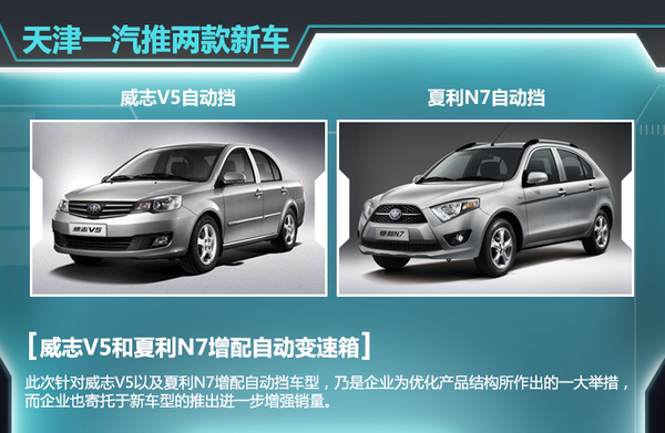 据了解,天津一汽年内将推出的两款车分别是威志V5自动挡和夏利N7自动挡,前者有望在7月推出,后者稍迟至8月推出。目前,天津一汽旗下产品多为手动挡车型,自动变速箱的缺失也成为抑制销量增长的一大因素,此次威志V5以及夏利N7增配自动挡车型,乃是企业为优化产品结构所采取的一大举措,其目的在于进一步加强销量。