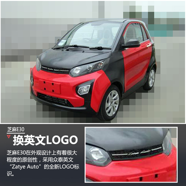 芝麻E30的消费群体锁定城市白领和家庭用户为主,为此众泰计划将该车的造型打造的更加时尚,一定程度上借鉴了宝马i3的设计元素。芝麻E30在外观设计上有着很大程度的原创性,采用众泰英文“Zatye Auto”的全新LOGO标识,彰显新车的国际化设计。
