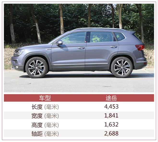 途岳的车身尺寸长、宽、高分别为4,453*1,841*1,632毫米,轴距达到2,688毫米,并且车身侧面线条十分流畅。新车腰线延伸至尾灯,与车门线的搭配造型如箭与弓的组合,充满张力。18英寸轮圈采用双色精车工艺,造型极富动感。