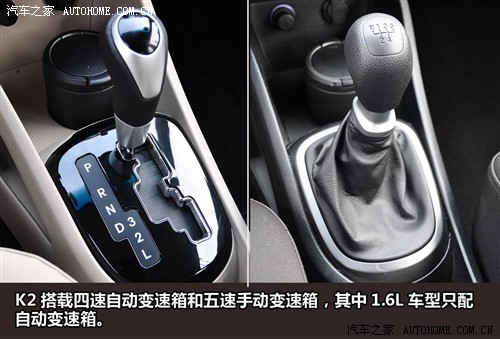 主要舒适性配置:在K2的高配车型上配有电动天窗、电动后视镜调节、驾驶席座椅高度调节、驾驶席座椅扶手、自发光仪表盘等;仅顶配车型上配有皮质座椅、皮质方向盘(带音响控制)、前排中央扶手杂物盒、后排座椅6:4分离放倒、智能钥匙/一键启动等。