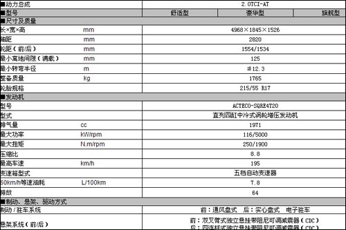 动力总成:新车搭载奇瑞自主研发的2.0T发动机,采用全铝材质、双顶置凸轮轴结构,最大功率116kW,最大扭矩250N.m。搭配5速手自一体自动变速箱,最高车速195km/h。瑞麒G6后期应该会有1.8T、2.0L TGDI、3.0L V6发动机及手动挡车型,以丰富产品序列。3.0L V6发动机的最大功率为146Kw,最大扭矩为278Nm。此外未来的加长礼宾车派拉蒙所搭载的3.0L V6的最大功率达到了220Kw,扭矩达到了350Nm,相比与普通版G6 3.0L动力的146Kw有很大提升,技术层面上看很可能是采用了增压技术。