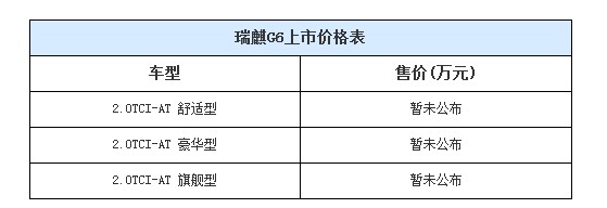 【搜狐汽车 新车】奇瑞旗舰车型瑞麒G6于8月1日在北京天安门国旗护卫队营地正式上市,新车上市发布会主题为与国同心,与志者同行——瑞麒G6国旗护卫队赠车仪式暨上市发布会。瑞麒G6诞生于奇瑞技术级别较高的B平台,与在售的东方之子、瑞麒G5属于同一技术平台,将成为现阶段奇瑞最高端的车型。此次上市的车型将配备同一发动机和变速器,共计三款车型,分别为2.0TCI-AT舒适型、2.0TCI-AT豪华型、2.0TCI-AT旗舰型。售价预计在19万元以上。