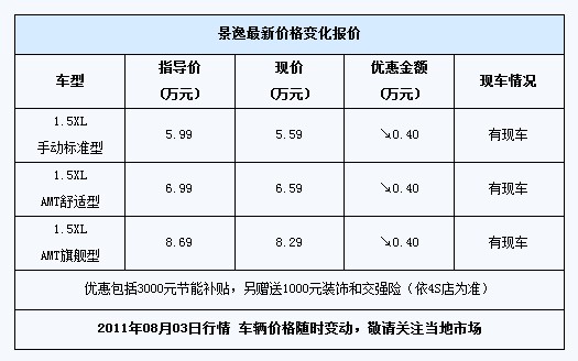 近日,编辑电访临沂阳光汽车贸易有限公司阳光专营店了解到,店内景逸车型有部分现车,目前该车型优惠现金1000元+3000元节能补贴,另赠送1千元的车内装饰和交强险(具体优惠依4S店为准),此活动到8月8号截止。有对该车感兴趣的朋友可以致电详细咨询。