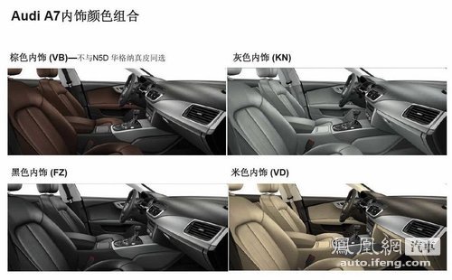 内饰方面,进口奥迪A7有四种颜色的内饰组合可供选择。三款车标配带有导航和手写输入的MMI系统和带有大灯清洗、灯光范围调整的双氙气大灯。最低配的A7 2.8FSI进取型带有基本的舒适性配置,包括四辐真皮多功能方向盘、带记忆功能的前电动座椅、带记忆和电动折叠的后视镜等。选装配置有自动泊车、奥迪预碰撞系统、LED前大灯、夜视系统等装备可以供选择,但是大部分选装件仅提供3.0TFSI两款车型选装。