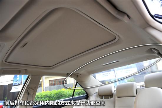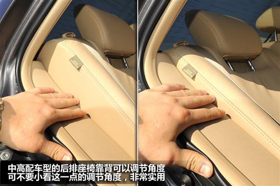 而新车的头部空间也得到了一定的优化,在不破坏车身强度的情况下,前后车顶都采用了内凹的设计,身高180cm的模特头部尚有接近一拳的余量,而后排的情况还要略好于前排,这点比老车强了不少。另外中高配车型的后排靠背可以调节角度,这点在同级车中非常少见,后排乘客很容易就能找到一个更舒服的位置,这点比近期上市的某加长车型那个接近直角的后排座椅强了很多。
