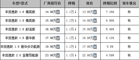 丰田逸致目前优惠11000元,赠送价值3000元的真皮座椅。店内现车颜色以珍珠白、水晶银为主,可以预订,订金5000元。喜欢该车的网友可到店内详细咨询。