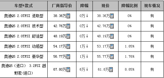 编辑建议:Q5是一汽奥迪旗下的中级SUV车型,虽然是中级车型,但是不论从动力、做工、配置等方面均可看出奥迪汽车的过人之处,而前、后多连杆独立悬挂也使得这款车拥有良好的操控性能。只是奥迪Q5目前长期处于加价购车的现状,但现在经销商给出了不同幅度的优惠,是比较合适入手的时候。