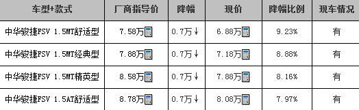 本地中华汽车经销商提供优惠:现在购买中华FSV可享7000元现金优惠。现车方面:目前店内新锐版车型没有现车,其它车型现车充足,颜色有白色、银白色和黑色。店内有试驾车,可试乘试驾。欢迎感兴趣的朋友到店详询。