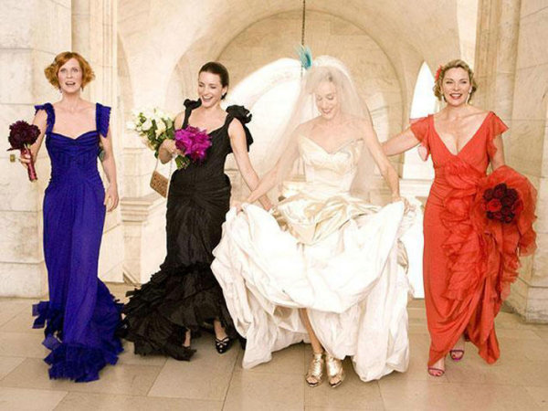 《Sex and theCity》(欲望都市)影片中,CarrieBradshaw没有让姐妹团为自己穿上同一件衣服,而是让他们自由地选择他们愿意穿的礼服。所以在影片中我们看到了穿着不同颜色衣服的伴娘,每一个都那么惊艳,让人印象深刻。