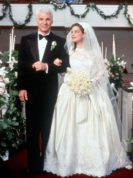 《新岳父大人(Father of the Bride)》。George Banks(SteveMartin饰演)的女儿如此迷人,怪不得他都不舍得嫁女儿了。这套蕾丝装点的礼服也许有点过于繁复,不过在这种场合下,还是非常体面的。