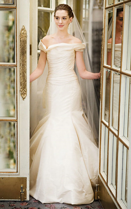在电影《新娘的战争(Bride Wars)》中,Anne Hathaway 以一件落肩的Vera Wang婚纱赢得了Chris Prat的芳心。