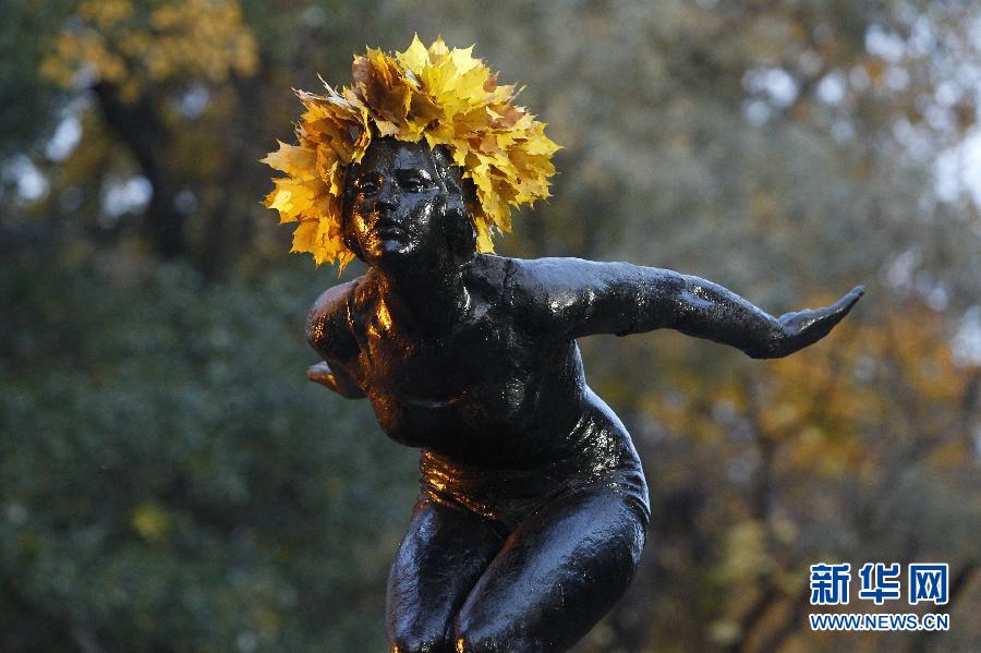 一叶落知天下秋。从枝头那一片落叶开始,秋天就这样走进了我们的视线。2011年10月8日,在俄罗斯首都莫斯科,枫叶装点着一尊雕塑。 新华社/路透