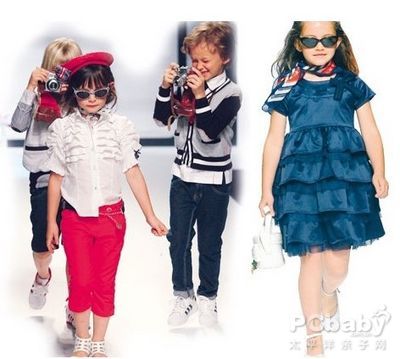 流行符号之一主要是成人化的色彩。文化味很浓的恤衫、亮片装饰的马甲、低胯收腿裤等还带有一种明显的摇滚味道。当然这一流行元素也充分考虑了孩子的特点,通花朵图案、蝴蝶结、娃娃衫等元素就是最好的证明。