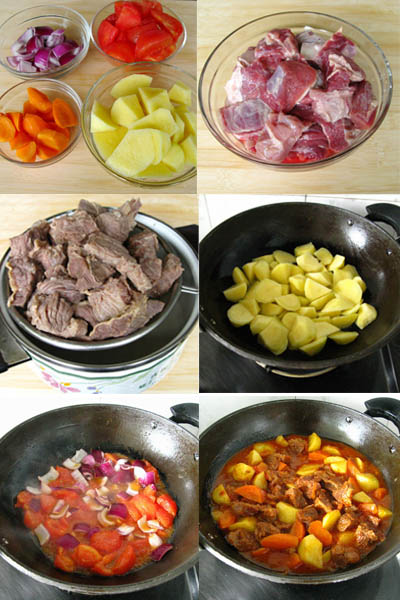 材料:牛肉、土豆、西红柿、洋葱、胡萝卜、盐、糖、胡椒粉。