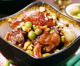 鸡肉100克、白洋葱1/2个、紫洋葱1/2个、青豆20克、红葱头蒜瓣各2个。