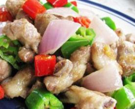 3、锅里剩少许的油,放入青红椒、洋葱炒香,再放入炸好的排骨,翻炒片刻即可。