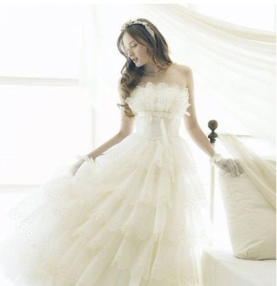 做个性感的小新娘吧。吊带的设计,性感妩媚。深V的设计,傲人的身材藏不住。腰间蕾丝珍珠镶嵌的花朵,充满了纯洁的美感。裙摆薄纱的叠加,使得整体非常完美。