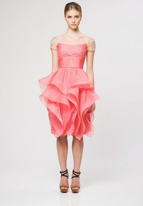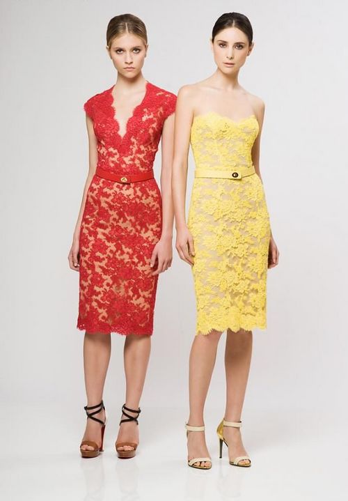 过膝A字裙是今年的流行趋势,朦胧的蕾丝质地温婉大气,明亮的黄色与热情的红色为婚礼增色不少。