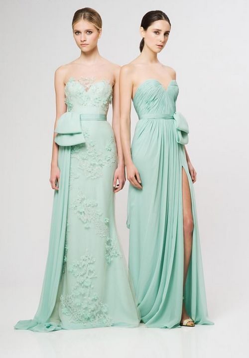 清爽薄荷绿雪纺礼服,性感的高开衩设计一展模特美好身材。