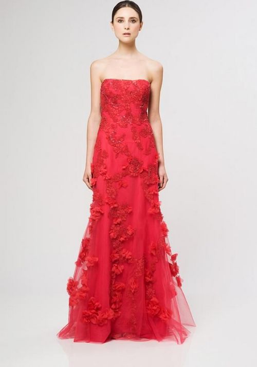 西瓜红色抹胸礼服,精致的刺绣与立体的花朵惟妙惟肖。
