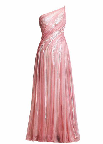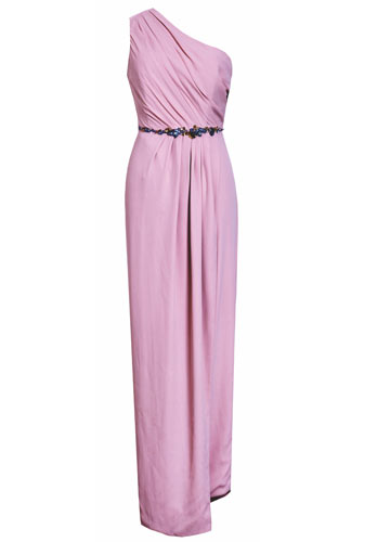 2. 淡粉色系礼服裙也分冷暖色调,肤色偏黄的伴娘,最好选用偏白的冷调粉红色,并用闪亮水晶元素来映衬自己的肤色。