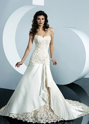 款式建议:宫廷式样的婚纱,有繁杂的手工缝制珠绣和层层叠叠的裙摆,金丝滚边增添华丽度。