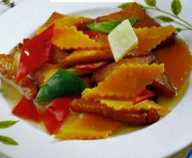 3、烧热炒锅内少许油,把熟胡萝卜片、熟土豆片和辣椒片放入爆炒几下,再把炸好的豆腐放入锅里,添上芡汁,翻炒几下即可。