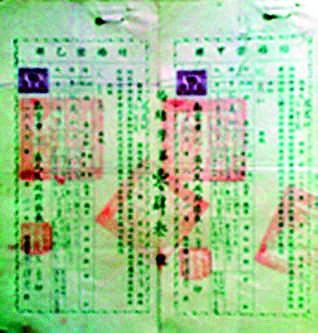 南京三联单式结婚证书(图1)。单证宽9厘米,高18厘米,草纸印制,墨点曲线花边,表格形式。格线及文字均为黑色,印章和税票为紫红色。婚书签发于1950年8月26日,是目前发现的由政府颁发的最早的成对甲乙联婚书。
