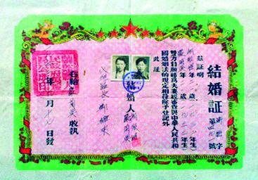 此时,新中国建立不到一年,婚姻法颁布仅仅三个多月,但从证书上看,婚姻登记工作已经步入正规。当事人在南京“两愿结婚,符合婚姻法之规定,发给结婚证”,男女双方各执一联。表格里填写双方的姓名、年龄、籍贯、职业、住址等基本情况,最后加盖南京市第三区人民政府印和区长王勇工作章。从婚书的栏目设计、文字内容和规范的印章税票上,充分体现了新社会男女平等和婚姻自主,体现了党和国家对婚姻登记工作的高度重视。这件婚书签发时间早,内容项目齐全,印章文字规范,三联证书标准,税票比较难得。建国初期三联单式婚书不少,甲乙联婚书稀见。时过60多年,双联保存完整、品相如此优美者极为罕见。婚姻法颁布以后已明令禁止在政府颁发的婚书上粘贴印花,因此这件婚书就显得更加珍贵。