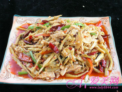 制作:将猪瘦肉洗净,切成6厘米左右的细丝,青笋同样制作,枸杞子洗净。待油七成热时,下人肉丝、笋丝煸炒,加入料酒、酱油、食盐、味精,放入枸杞,翻炒几下,淋人麻油即可。