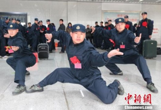 东方网12月20日消息:12月19日上午,河南郑州火车站,准备前往广东湛江的30名新入伍的海军陆战队员成为过往旅客中一道亮丽的风景。因为他们均是从曾参加过2008年北京奥运会开、闭幕式和连续10年春晚表演的嵩山少林武术职业学院挑选出来的,即有武术特长,又有较高文化素质。