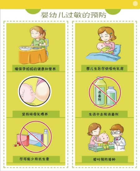 预防婴儿过敏要从准妈妈怀孕期间开始准备,准妈妈的健康和营养状况以及孩子出生后尽早吸吮妈妈乳房第一口母乳喂养是预防过敏的关键。怀孕期间,应注意营养,特别是肠道和免疫状况。若孕前或怀孕期出现食物过敏,应尽可能躲避过敏食物;若孕期出现感染,要合理使用抗生素;若肠胃不适,应使用活性益生菌。有研究表明,孕末3个月服用益生菌,可以预防此后婴儿过敏。