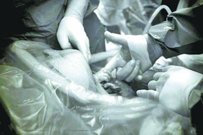 图为剖腹产女婴内瓦伊赫从母亲子宫中伸出小手抓住医生手指。