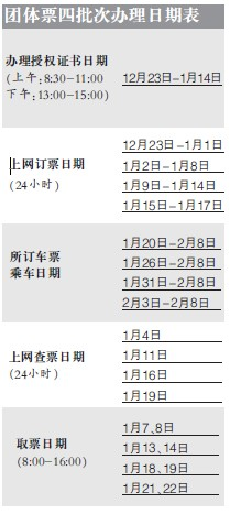 值得注意的是,今年团体票的订购首次采取网络申办,订票负责人务必须在规定时间内上网提交和确认信息,以免车票自动取消。