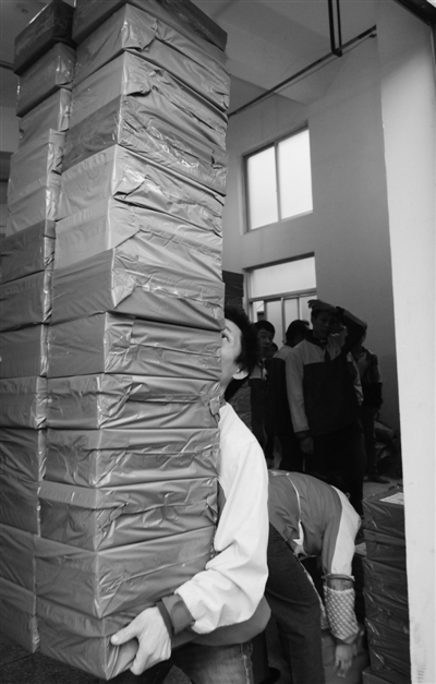 温州卡劲贸易有限公司天猫店4月份进驻鹿城藤桥南寺中路的韵达快递。从昨天凌晨5点到了下午3点,卡劲共卖出近2万双鞋子,第一批打出来1万来张订单。等整理好的货物快达到3000件时,员工方国泉跑到对门的韵达快递叫了30个操作员来搬运。仅用了9分钟,他们便把3000个快递件搬到了流水线门口。到发货时,整个流程花了不到30分钟。