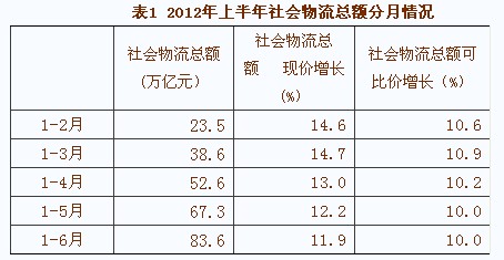 中国物流与采购联合会发布的《2012年上半年物流运行情况分析》显示,上半年,我国物流运行总体保持适度增长。社会物流总额较快增长,增速缓中趋稳;物流业增加值稳步增长;物流业固定资产投资增速有所提高。但社会物流总费用居高不下,反映宏观经济运行的质量和效率偏低;物流企业成本上升,效益持续下滑,行业发展的后劲和活力受到影响,对这些问题仍要引起密切关注。