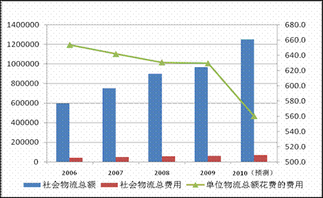 我国社会物流总额2010年预计为125万亿元,“十一五”时期将达到446万亿元,是“十五”时期的2.8倍,年均增长21%,扣除价格因素,可比增长15%左右。这一速度明显快于同期GDP的增长水平,反映了我国物流需求仍处在较高增长期。根据测算,2005年单位GDP对社会物流需求的系数为1:2.6,2009年为1:2.8,2010年预计达到1:3.2,表明目前我国每单位GDP产出需要3.2个单位的物流总额来支持,比2005年提高了23%,反映出物流需求对国民经济支撑作用进一步增强。