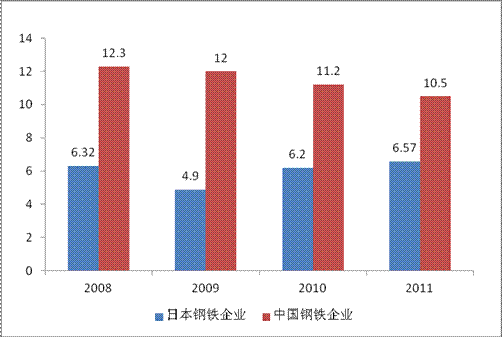 2011年日本钢铁企业物流费用率仅为6.6%,比我国低3.9个百分点。与上年同期相比,中日企业物流费用率差距缩小1.1个百分点。